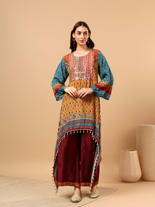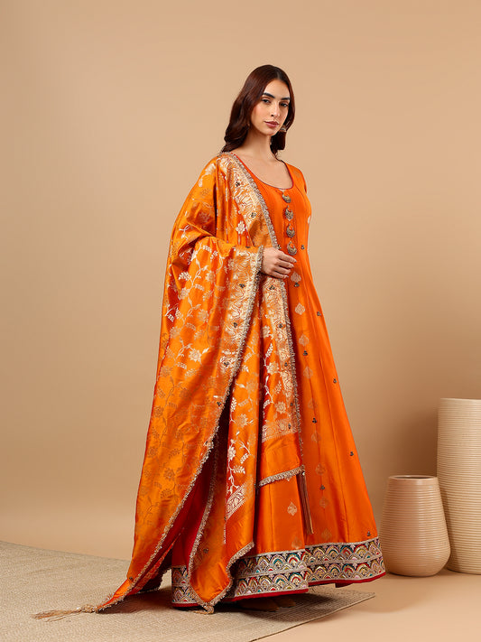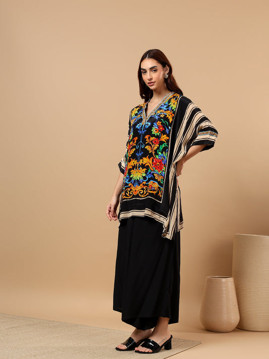 Orange Hand-Embroidered Cape Set with Flared Pants