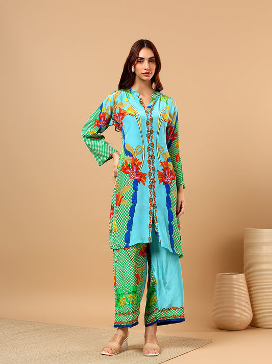 Ice Blue Satin Cape Set with Cowl Drape Skirt