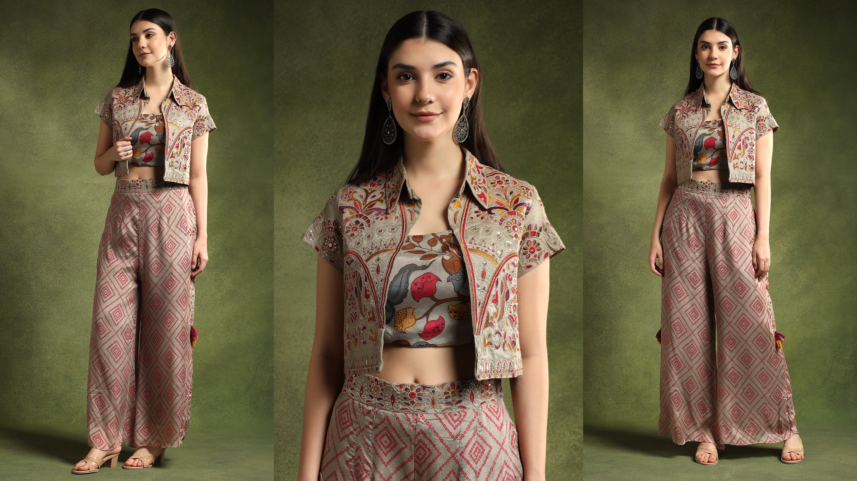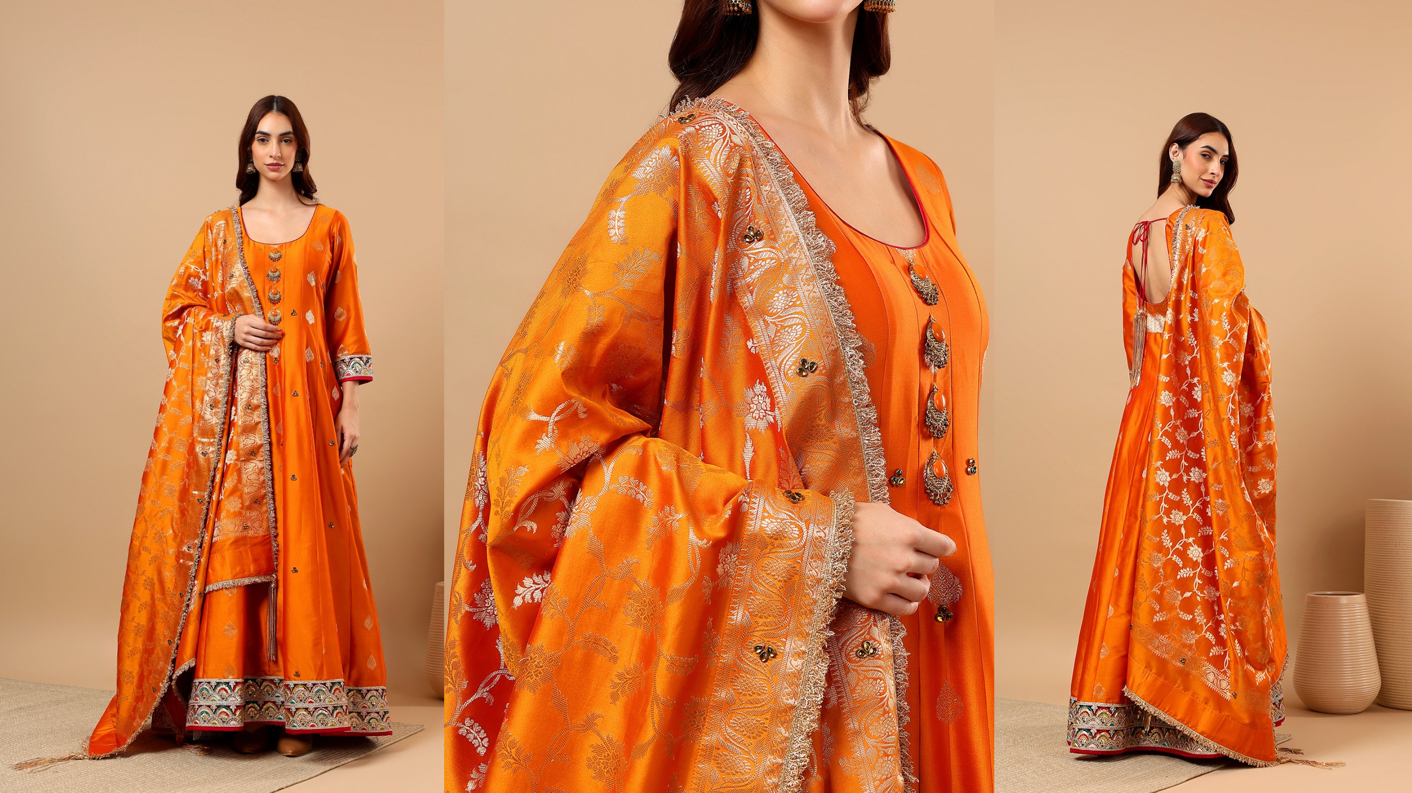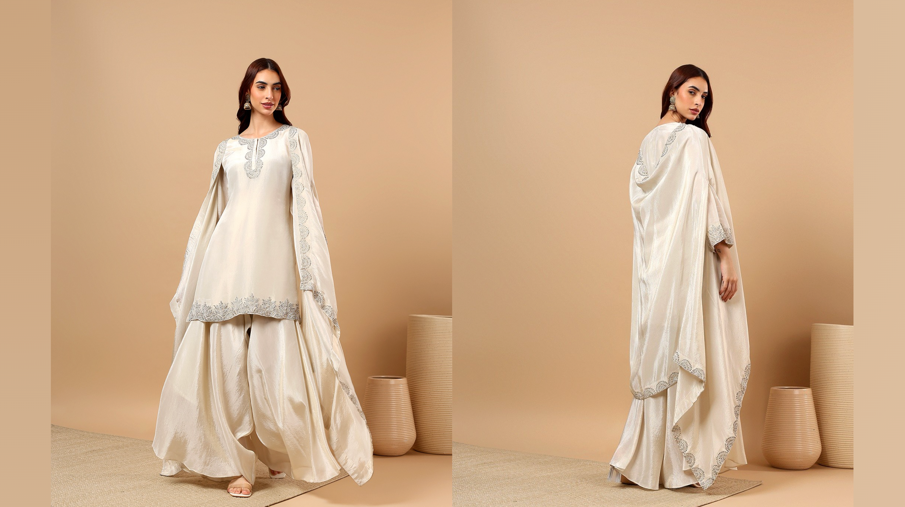 Orange Hand-Embroidered Cape Set with Flared Pants