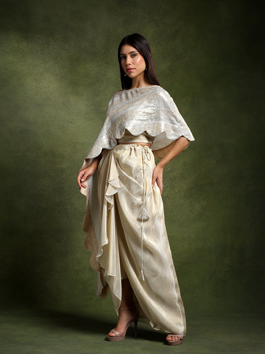 Ivory Organza Draped Skirt with Sequenced Scalloped Kimono