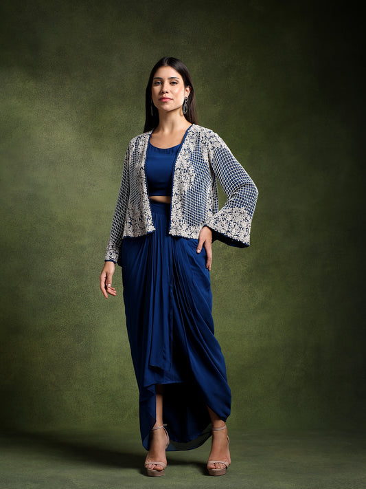 Royal Blue Cowl Drape Skirt Set with Hand Crafted Jacket.