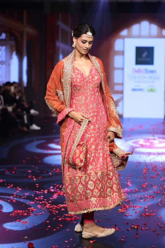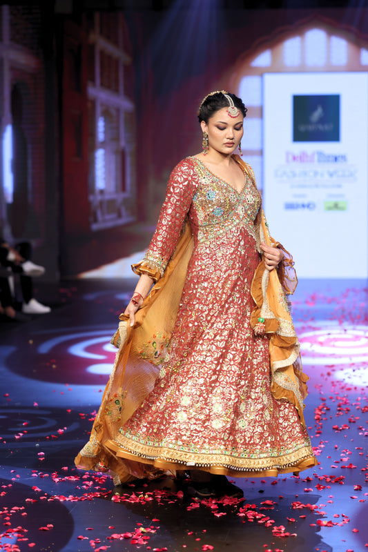 Ghungroo Peach Zari & Aari Work Anarkali with Rust Banarsi Dupatta