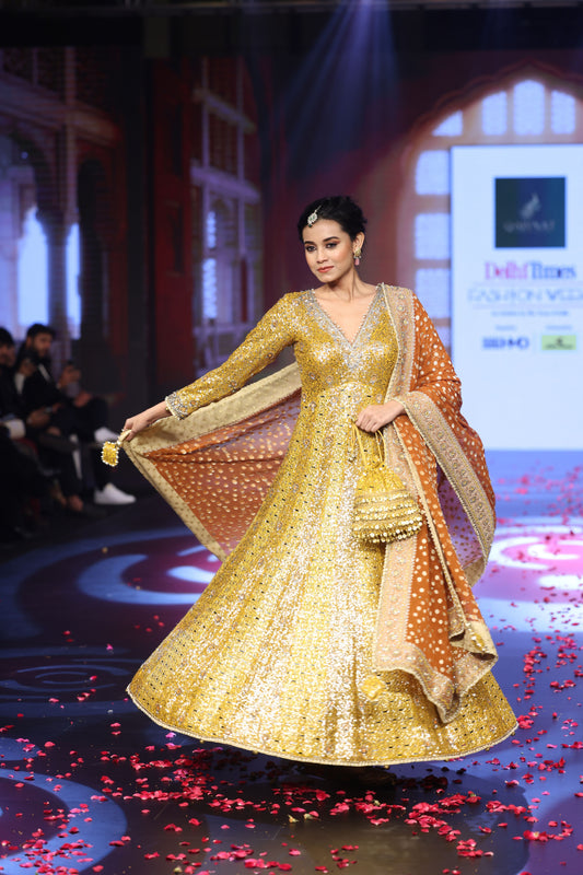 Ghungroo Yellow Sequence & Mirror Work Anarkali with Burnt Orange Banarsi Dupatta