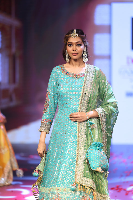 Ghungroo Turquoise Hand-Embroidered Zari Aari Silk Anarkali with Green Dupatta