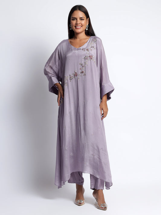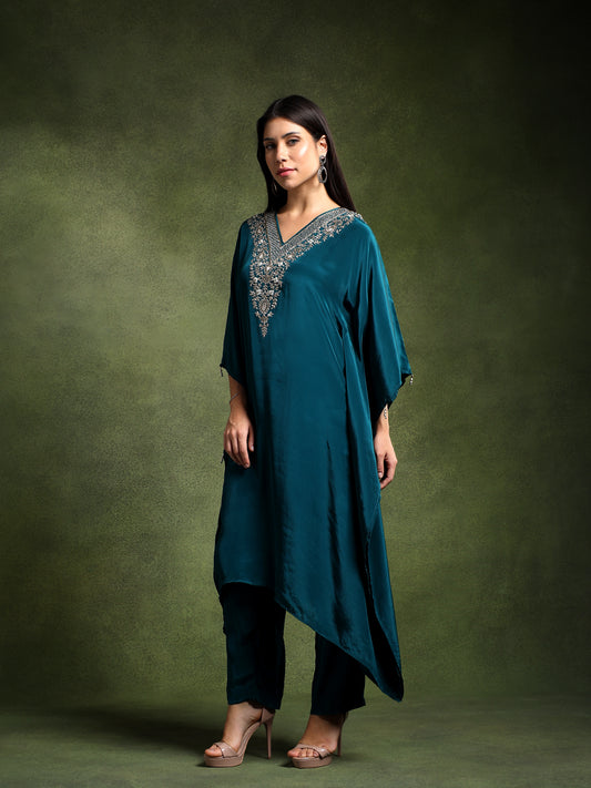 Blue Crepe Hand Embroidered Kaftan with Pants