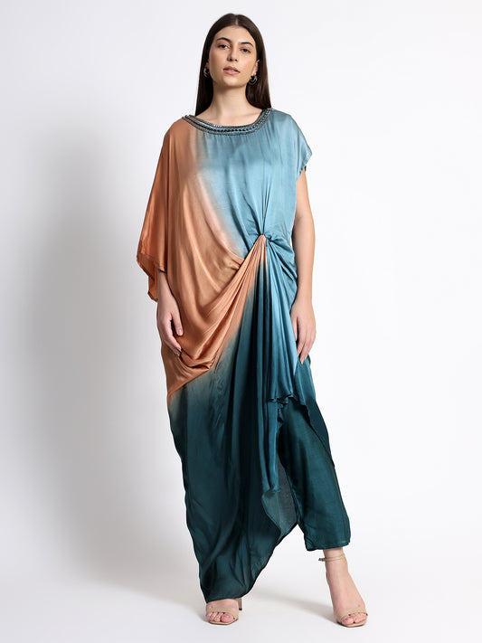 Turquoise Knotted Satin Kaftan with Teal Pants