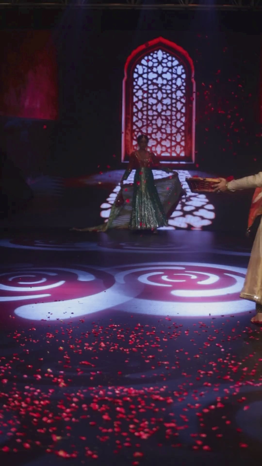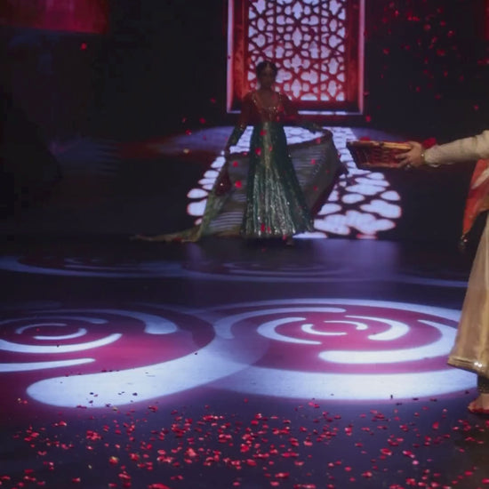 Presented at Delhi Times Fashion Week, this Ghungroo Anarkali is crafted in luxurious silk and adorned with intricate hand embroidery. Delicate ghungroo embellishments accentuate the hemline and cuffs, lending a subtle rhythm and movement to the silhouette. The striking green and red palette is complemented by a fluid drape and a finely hand-embellished dupatta. A timeless expression of craftsmanship, tradition, and understated grandeur.